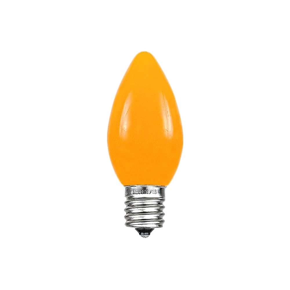 Novelty Lights Orange Colored C7 LED Smooth Ceramic Bulbs (plastic), have the traditional look of our popular incandescent ceramic bulbs, but are 90% more energy efficient! These LED ceramic plastic bulbs will save you money on energy costs, but you can still enjoy the same vintage look of a painted ceramic bulb. Unlike their incandescent counter-parts, these bulbs will not get hot, giving you more options for indoor and outdoor applications, and they are plastic so they won’t break! Lasting 40,000 hours, these vintage Orange colored bulbs will provide years of beautiful holiday illumination for your Christmas tree, roofline display, or outdoor Christmas light display. Use these antique style, yet energy efficient bulbs with our C7 Stringers (10’, 12.5’, 25′ & 100′), our E12 Heavy Duty Light Strings (25′, 100′ & 330′), our commercial grade bulk C7 Bulk spools as well as our vintage Twisted Wire Strings with E12 Bakelite Sockets. Each bulb utilizes 2 Ultra-Bright SMD LED Technology, does not produce heat.