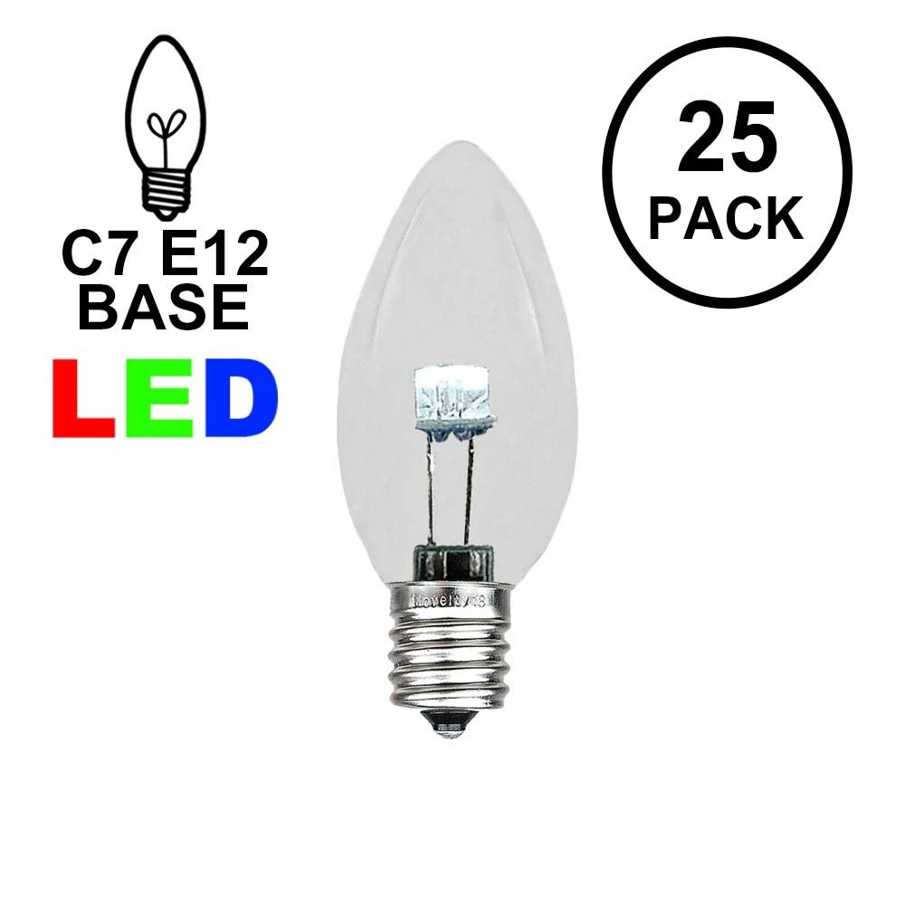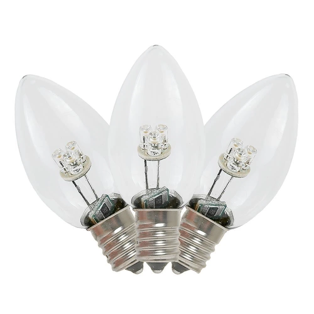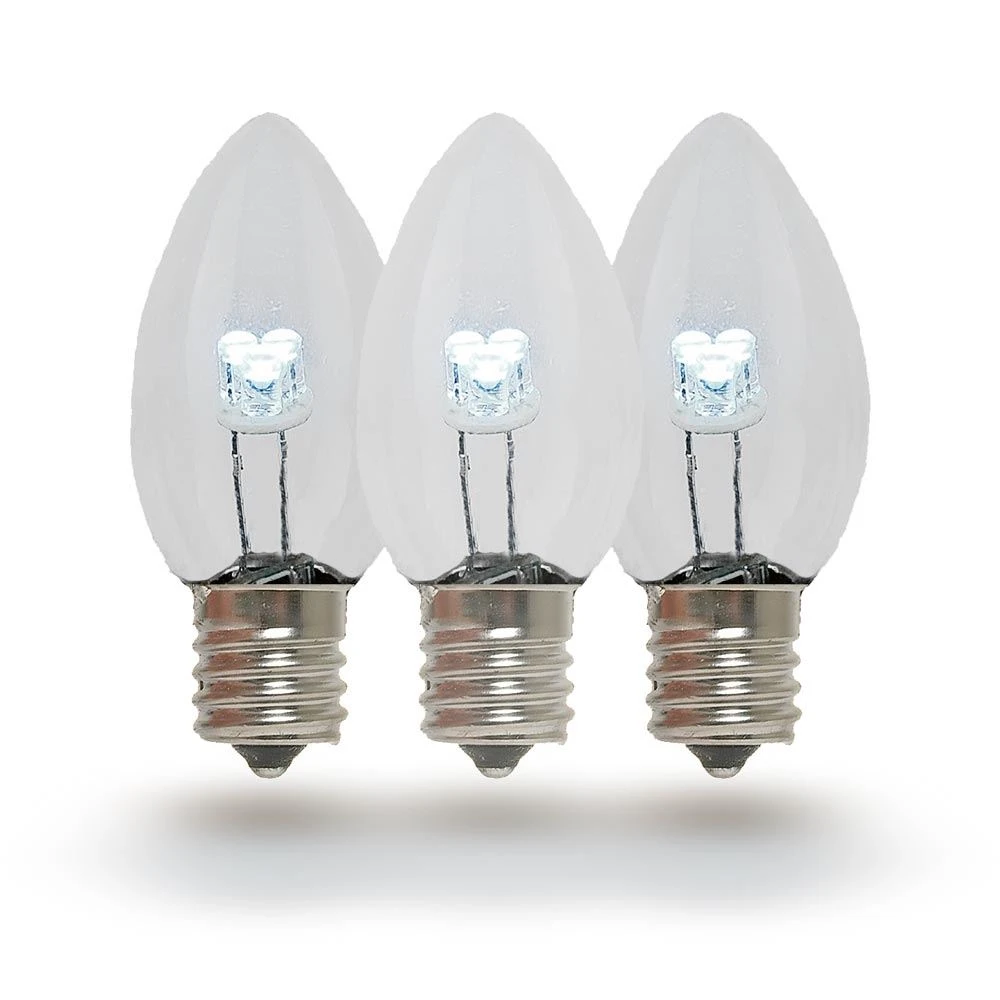 Novelty Lights beautiful, energy-efficient glass LED Pure White C7 bulbs for long-lasting, vibrant, Christmas light displays. Our glass LED bulbs are as versatile as they are stunning; use them as outdoor string lights or party lights in the summer and as Christmas tree lights, roofline bulbs and outdoor Christmas light displays in the winter. The smooth glass material of these bulbs is reminiscent of traditional incandescent Christmas lights and gives them an antique look. Our Pure White energy efficient bulbs use 1/10 the energy of their incandescent counterparts, yet they are just as bright; each bulb has 3 vibrant diodes, does not produce heat, and is vibration resistant. If you are using C7 LED bulbs for the first time or if you are retrofitting your old C7 strings, our glass LED C7 Pure White Christmas lights are the stunning, smart, green, and energy-efficient solution. Our C7 glass LED bulbs can be used with our C7 Stringers (10’, 12.5’, 25′ & 100′), our E12 Heavy Duty Light Strings (25′, 100′ & 330′), our commercial grade bulk C7 Bulk spools as well as our vintage Twisted Wire Strings with E12 Bakelite Sockets.