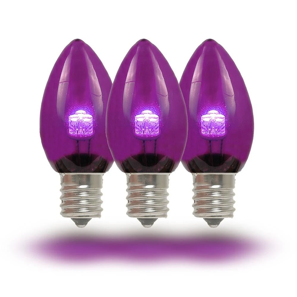 Novelty Lights beautiful, energy-efficient glass LED Purple C7 bulbs for long-lasting, vibrant, Christmas light displays. Our glass LED bulbs are as versatile as they are stunning; use them as outdoor string lights or party lights in the summer and as Christmas tree lights, roofline bulbs and outdoor Christmas light displays in the winter. The smooth glass material of these bulbs is reminiscent of traditional incandescent Christmas lights and gives them an antique look. Our Purple energy efficient bulbs use 1/10 the energy of their incandescent counterparts, yet they are just as bright; each bulb has 3 vibrant diodes, does not produce heat, and is vibration resistant. If you are using C7 LED bulbs for the first time or if you are retrofitting your old C7 strings, our glass LED C7 Purple Christmas lights are the stunning, smart, green, and energy-efficient solution. Our C7 glass LED bulbs can be used with our C7 Stringers (10’, 12.5’, 25′ & 100′), our E12 Heavy Duty Light Strings (25′, 100′ & 330′), our commercial grade bulk C7 Bulk spools as well as our vintage Twisted Wire Strings with E12 Bakelite Sockets.