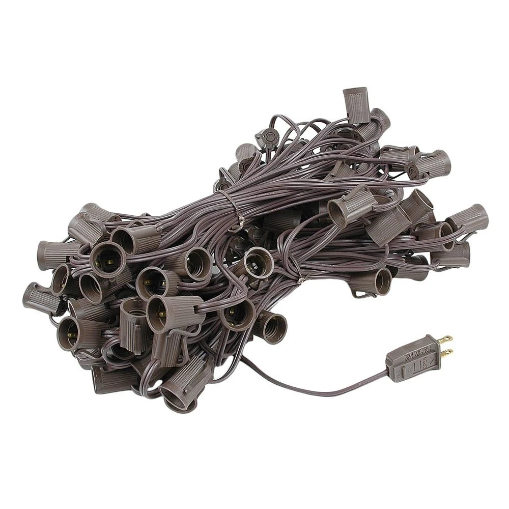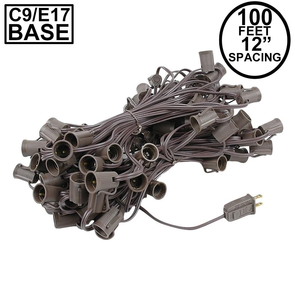 Novelty Lights 100-foot Brown wire stringer (e17) Intermediate base for Incandescent C9 bulbs and C9 LED bulbs is perfect for creating your beautiful Holiday lighting display. Our C9 strings can be used indoors and outdoors for lighting up your roofline, fences, trees, and pergolas. Our C9 100 foot Brown string is made with 100 admiral brand sockets spaced 12” apart on 20 gauge SPT-1 wire. Our C9 strings can be used with our C9 Ceramic 7 watt bulbs, C9 Transparent 7watt bulbs, C9 LED Plastic Faceted and Ceramic .8 watt bulbs, C9 LED glass .75 watts bulbs, and our Incandescent and LED G50 globe bulbs. Please look at our FAQ tab to find more information.
