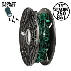 C9 250′ Spool Magnetic string on 15″ Spacing used for homes, office buildings, barns, and restaurants. These magnetic sockets will adhere to any ferrous metals(Iron and Steel) making for quick installations since there in no need for christmas light clips. Perfect for rooflines, building flashing, and gutters. No need for screws, glues, clips just adhere the magnetic C9 socket to you metall surface saving time and labor cost. We use Neodymium grade magnets which are the strongest magnets available. Each magnet is is plated with nickel protective coating which prevent rust. Use this 250-foot, Green wire stringer for C9 incandescent, C9 retrofit LED, G50 globe-shaped bulbs. Safe for indoor and outdoor use.