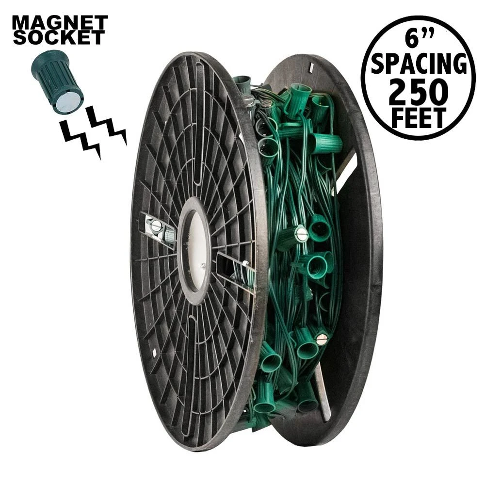 C9 250′ Spool Magnetic string on 6″ Spacing used for homes, office buildings, barns, and restaurants. These magnetic sockets will adhere to any ferrous metals(Iron and Steel) making for quick installations since there in no need for christmas light clips. Perfect for rooflines, building flashing, and gutters. No need for screws, glues, clips just adhere the magnetic C9 socket to you metall surface saving time and labor cost. We use Neodymium grade magnets which are the strongest magnets available. Each magnet is is plated with nickel protective coating which prevent rust. Use this 250-foot, Green wire stringer for C9 incandescent, C9 retrofit LED, G50 globe-shaped bulbs. Safe for indoor and outdoor use.