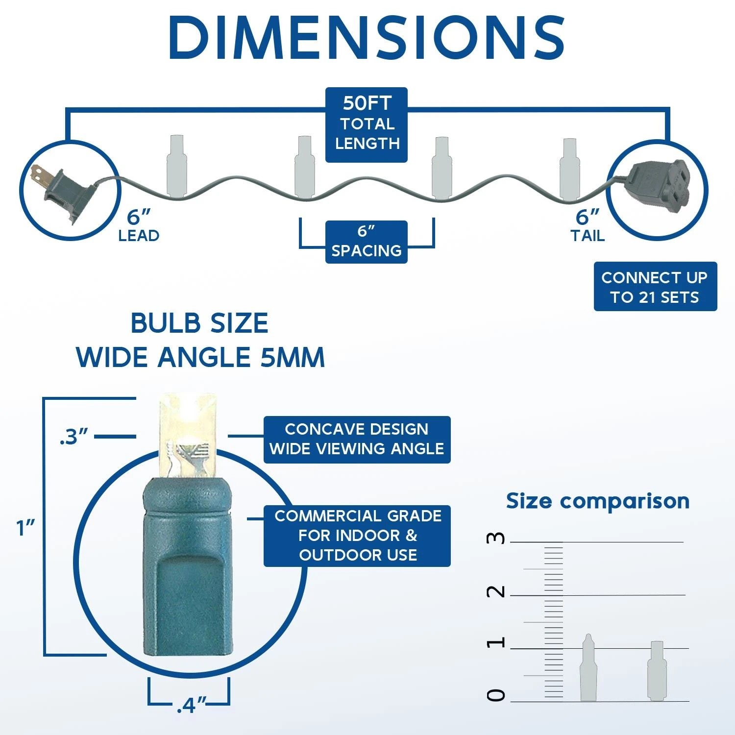 Our super bright 100 light Warm White Wide Angle Mini Lights on green wire have 100 commercial grade LED’s on 6″ centers making each string 50′ long. These strings have non-removable LED’s; this eliminates failures from loose, broken, or removed bulbs. These commercial grade warm white LED Christmas lights are very durable long lasting and extremely energy efficient. Each string is full wave rectified, which eliminates any flickering making these LED Christmas lights brighter than ordinary LED mini Lights. Each LED uses a patented concave design making these LED viewable from all angles. Energy Star qualified and UL Listed for indoor and outdoor use. Connect up to 21 strings end-to-end.