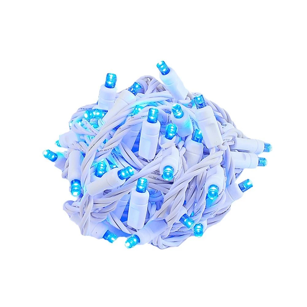 Our super bright 50 light Blue Wide Angle Mini Lights on white wire have 50 commercial grade LED’s on 6″ centers making each string 25′ long. These strings have non removable LED’s; this eliminates failures from loose, broken or removed bulbs making these commercial grade LED Christmas lights very durable, long lasting and extremely energy efficient. Each string also is full wave rectified which eliminates any flickering while making these LED Christmas lights brighter than ordinary LED mini Lights. Each LED uses a patented concave design making these LED viewable from all angles. . Energy Star qualified and UL Listed for indoor and outdoor use. Connect up to 43 strings end-to-end.