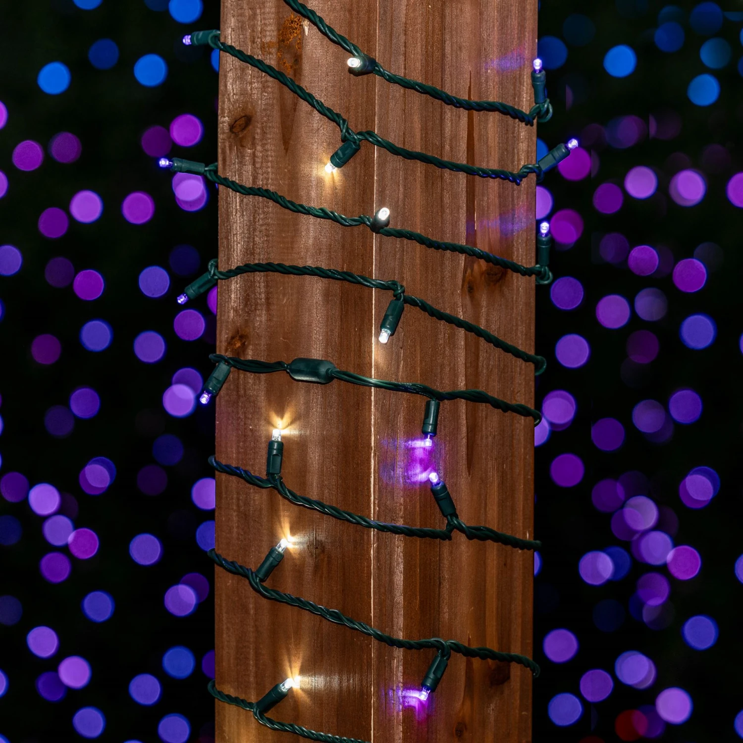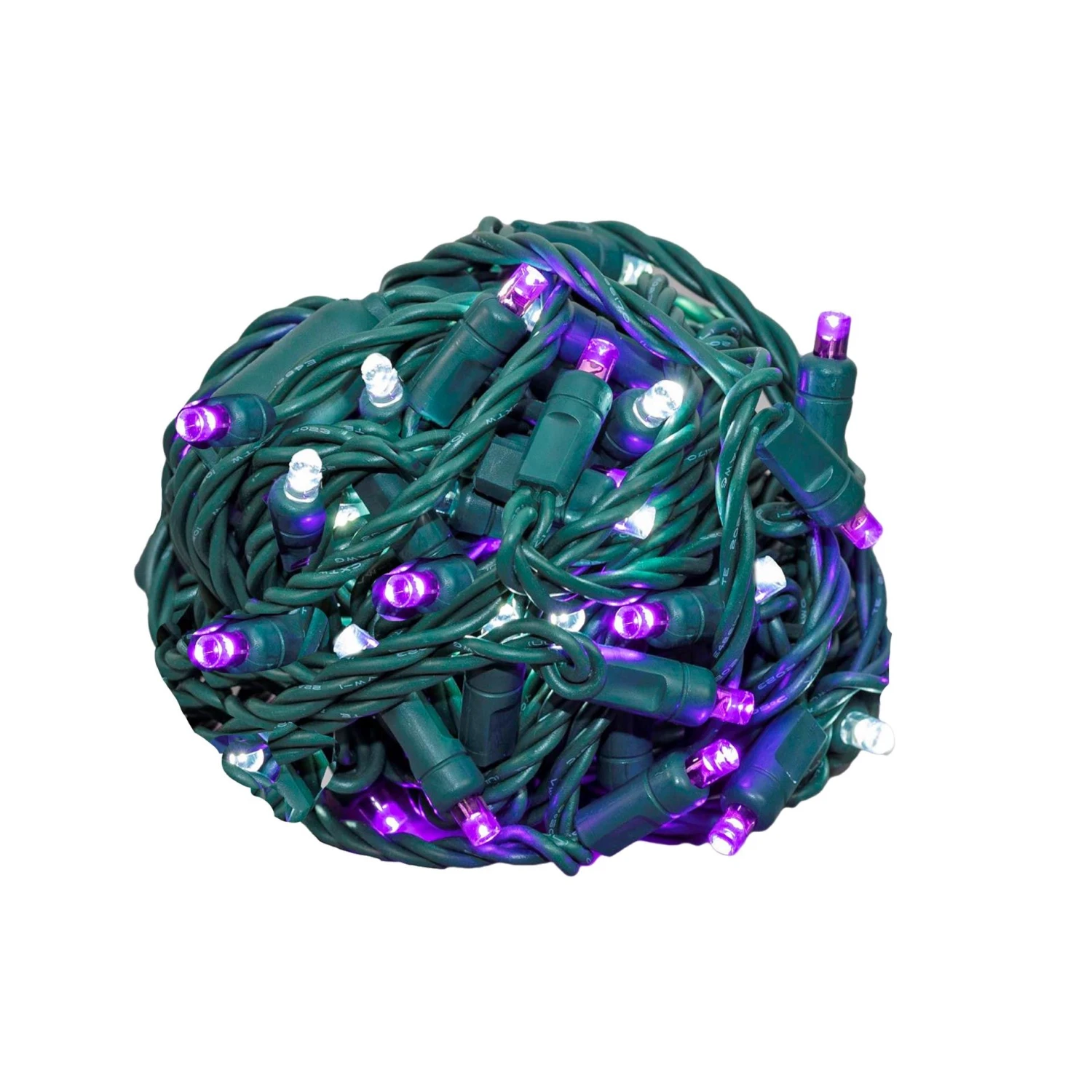 Our super bright 50 light Purple & Pure White Wide Angle Mini Lights on green wire have 50 commercial grade LED’s on 6″ centers making each string 25′ long. These strings have non removable LED’s; this eliminates failures from loose, broken or removed bulbs making these commercial grade LED Christmas lights very durable, long lasting and extremely energy efficient. Each string also is full wave rectified which eliminates any flickering while making these LED Christmas lights brighter than ordinary LED mini Lights. Each LED uses a patented concave design making these LED viewable from all angles. Energy Star qualified and UL Listed for indoor and outdoor use. Connect up to 43 strings end-to-end.