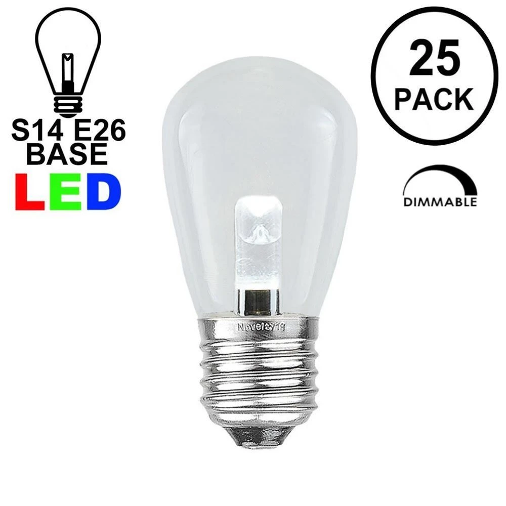 Enhance your outdoor settings with our Designer LED S14 Bulbs. Upgrade your outdoor entertainment areas with our New Designer Series LED bulbs. These LED S14 bulbs offer a perfect warm night time glow using a 1.4 Watt SMD Optic Core with a 25,000 bulb life. Perfect for replacing your outdated 11 watt S14 bulbs. These bulbs are fully dimmable, E26 Nickle Base, and UL Listed. These S14 bulbs are made of glass so they will not fade or discolor. As well as being IP65 approved for wet locations making them perfect for any outdoor application. Our Designer Series S14 bulbs will fit our e26/medium base commercial grade light strings.