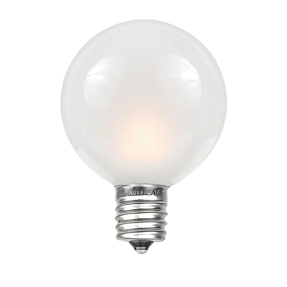 Our frosted white globe-shaped, satin finish G50 Bulbs create a fun, unique look when decorating for any special occasion. Perfect for weddings, tents, patios, awnings and Christmas decor, these round, 7-watt, 130-volt bulbs will screw into a C7 socket/Candelabra base and last for 3000 hours. Our G50 satin white bulbs are sold in packs of 25. You will qualify for a wholesale discount when buying at least 20 packs of 25 bulbs.