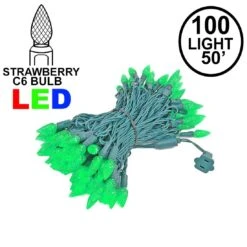 Our 100 light Commercial Grade Green C6 LED Strawberry Lights are sure to brighten up any holiday display or special event. These high quality LED Christmas light sets are built using nonremovable high quality super bright LED’s that will last several years. Because these sets use one-piece non-removable bulbs, failures due to broken, damaged, removed, or burnt-out bulbs, are eliminated. These Green LED mini light strings have 100 LED’s spaced every 6″ making them 50′ long. Our C6 LED mini Christmas lights have high quality, built-in, full wave rectifiers, making them extremely bright without any flicker. Connect up to 43 strings end-to-end. UL Listed for indoor and outdoor use and Energy Star qualified.
