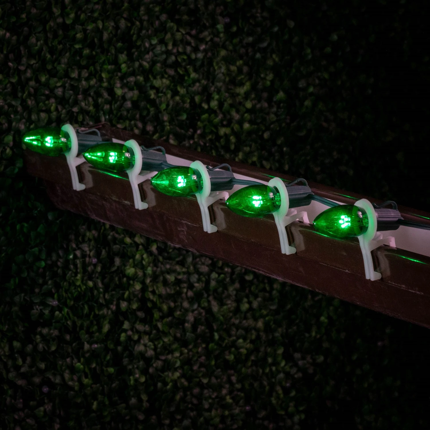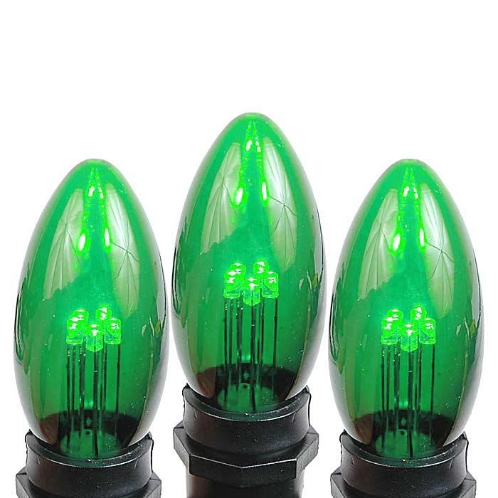 Novelty Lights C9 Green smooth glass LED bulbs with 5 super bright and energy efficient LEDs will bring beauty to your next decorating project. The C9 glass bulb, unlike it’s incandescent counter-parts, will not get hot, giving you more options for indoor and outdoor applications! The C9 Glass Green bulb will bring that traditional and classic look to your roofline, trees, backyard BBQ or other Holiday installation without the added cost. The C9 glass bulbs have a 3 season; 40,000 hour warranty. Our Green glass C9 bulbs can be used with any of our C9 Stringers (10’, 12.5’, 25′ & 100′), our E17 Heavy Duty Light Strings (25′, 100′ & 330′), our commercial grade bulk C9 Bulk spools as well as our vintage Twisted Wire Strings with E17 Bakelite Sockets.