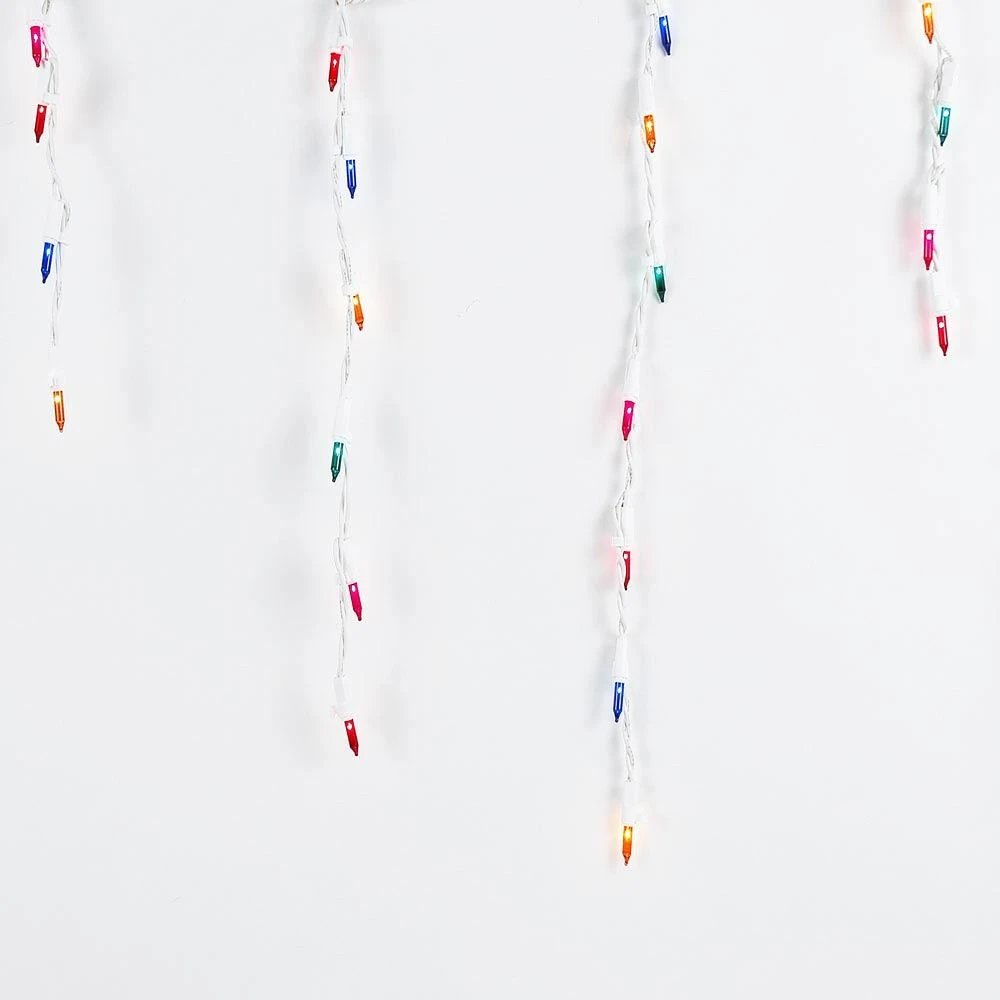 Commercial Grade Medium Drop Multi colored lights on White Wire Icicle Lights create perfect lines of winter bliss for any residence, commercial building or municipality. Each set of Multi 9′ long white wire has 18 medium drops ranging from 9″ to 15″ with a total of 100 commercial grade icicle lights. Connect up to 5 strings for a total running length of 45′. We include 3 replacement lamps with each string and encourage you to buy our commercial grade Icicle Light Clips for quick and easy installation. UL listed for indoor or outdoor use.