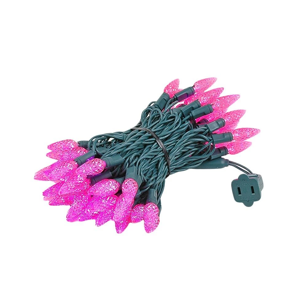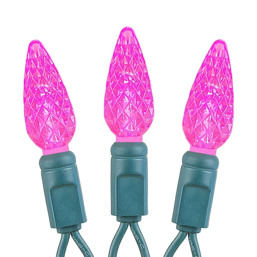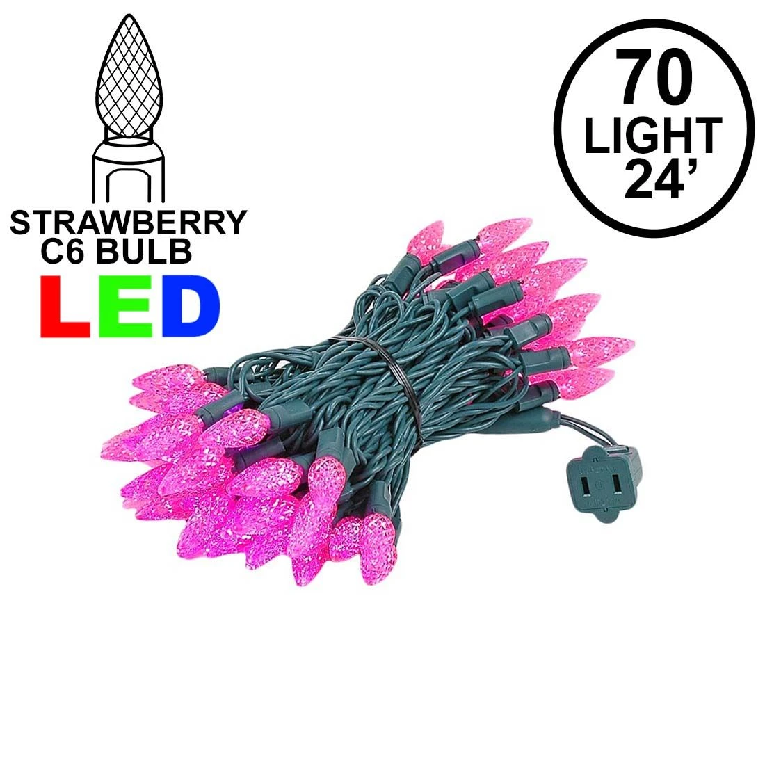 Our 70 light Commercial Grade Pink C6 LED Strawberry Lights are sure to brighten up any holiday display or special event. These high quality LED Christmas light sets are built using nonremovable high quality super bright LED’s that will last several years. Because these sets use one-piece non-removable bulbs, failures due to broken, damaged, removed, or burnt-out bulbs, are eliminated. These Pink LED mini light strings have 70 LED’s spaced every 4″ making them 24′ long. Our C6 LED mini Christmas lights have high quality, built-in, full wave rectifiers, making them extremely bright without any flicker. Connect up to 43 strings end-to-end. UL Listed for indoor and outdoor use and Energy Star qualified.