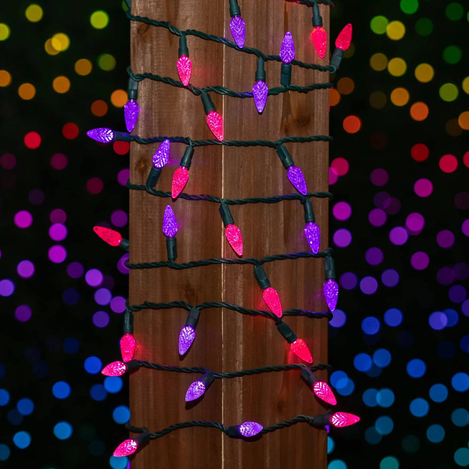 Our 70 light Commercial Pink & Purple C6 LED Strawberry Lights are sure to brighten up any holiday display or special event. These high quality LED Christmas light sets are built using nonremovable high quality super bright LED’s that will last several years. Because these sets use one-piece non-removable bulbs, failures due to broken, damaged, removed, or burnt-out bulbs, are eliminated. These Green and White LED mini light strings have 70 LED’s spaced every 4″ making them 24′ long. Our C6 LED mini Christmas lights have high quality, built-in, full wave rectifiers, making them extremely bright without any flicker. Connect up to 43 strings end-to-end. UL Listed for indoor and outdoor use and Energy Star qualified.