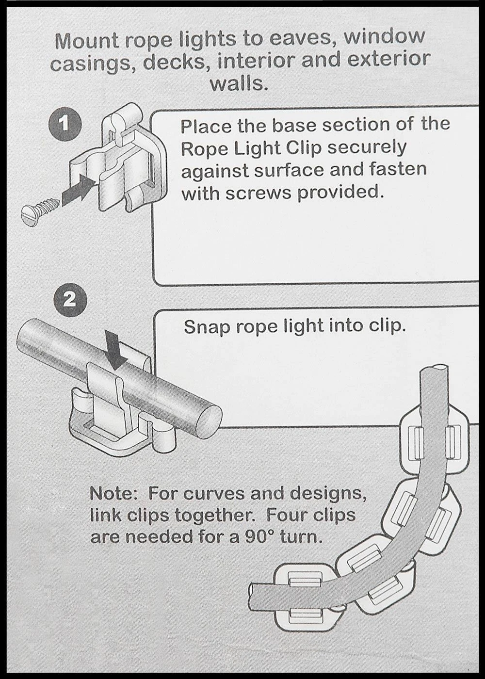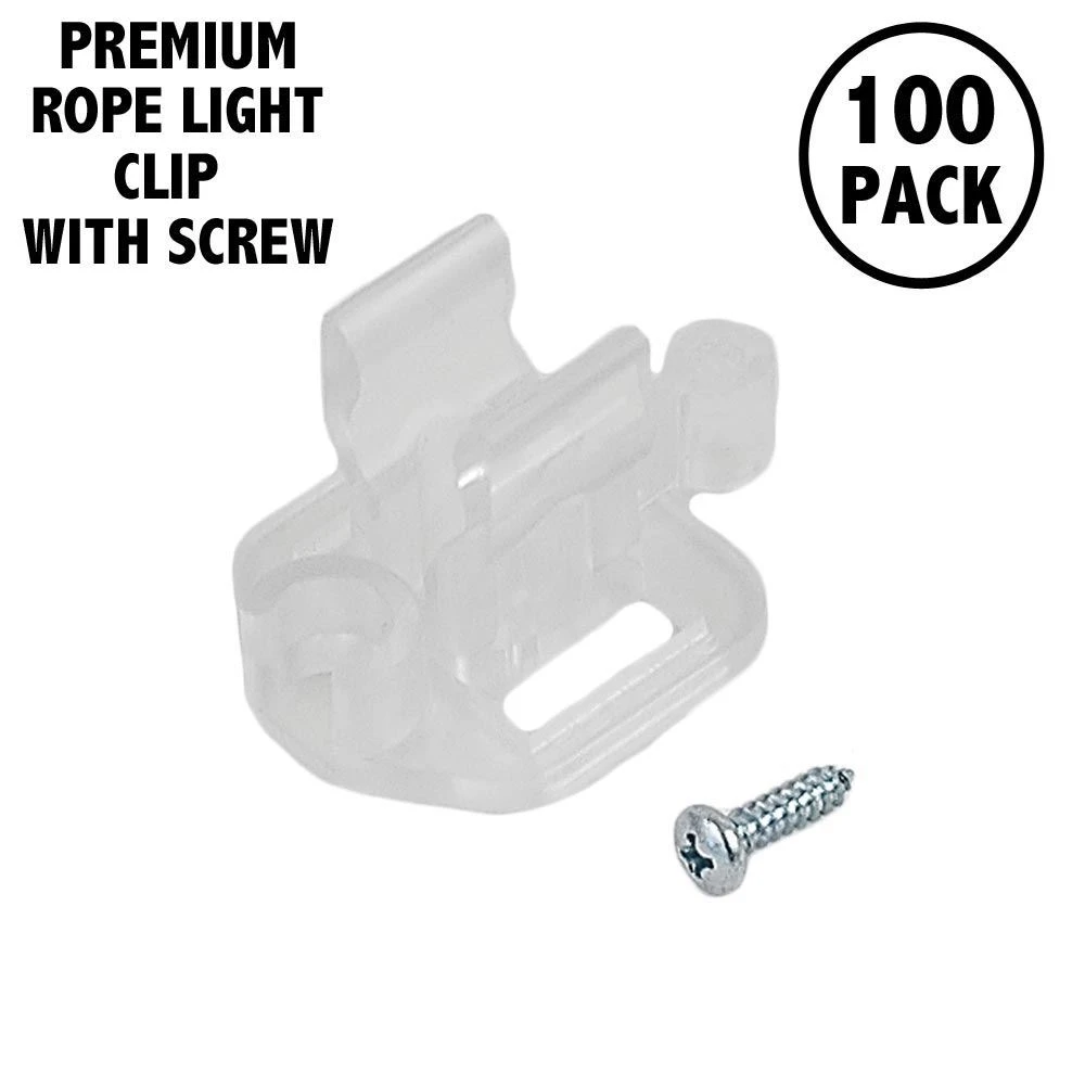 This is the ideal way to hang 1/2″ rope light. These premium clips with screws are made of hard plastic and are a mounting option for installing rope lights. These premium clips are high quality and can be connected end to end. Each pack comes with 100 plastic clips and 100 screws for mounting.