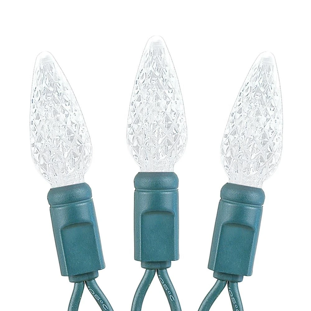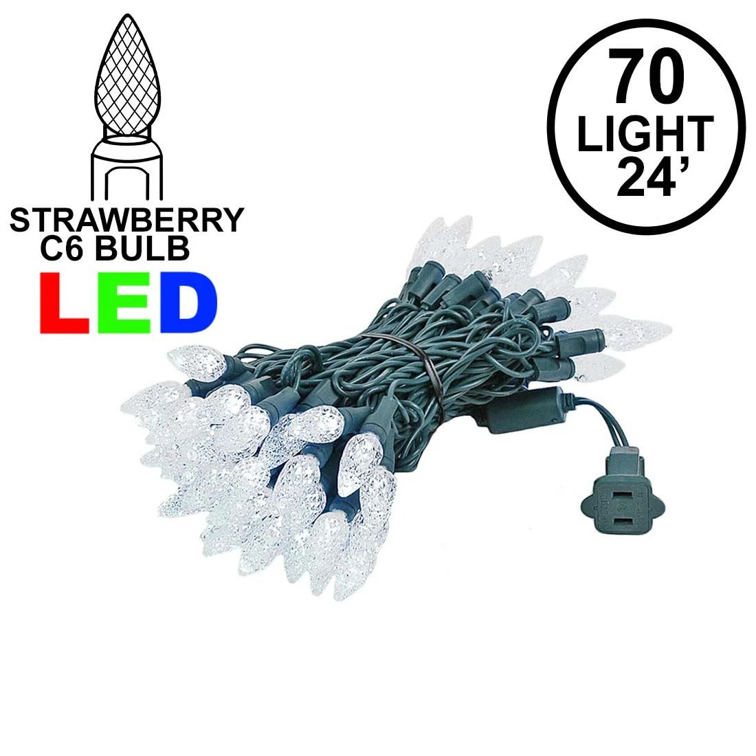Our 70 light Commercial Grade Pure White C6 LED Strawberry Lights are sure to brighten up any holiday display or special event. These high quality LED Christmas light sets are built using nonremovable high quality super bright LED’s that will last several years. Because these sets use one-piece non-removable bulbs, failures due to broken, damaged, removed, or burnt-out bulbs, are eliminated. These Pure White LED mini light strings have 70 LED’s spaced every 4″ making them 24′ long. Our C6 LED mini Christmas lights have high quality, built-in, full wave rectifiers, making them extremely bright without any flicker. Connect up to 43 strings end-to-end. UL Listed for indoor and outdoor use and Energy Star qualified.