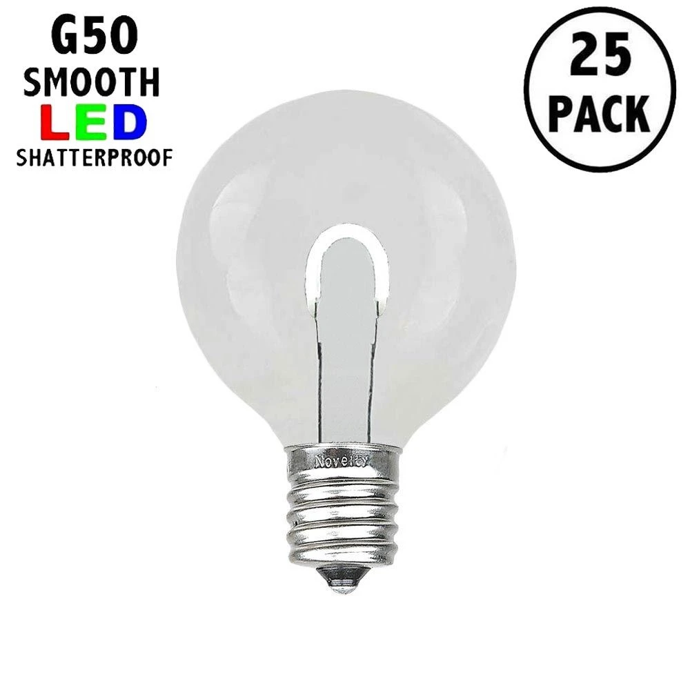 Novelty Lights Pure White G50 U-Shaped Flexible Filament LED Plastic Filament Retrofit replacement lamps, utilize a Flexible(U-Shaped) Filament design for veiwing from all angles. Switch out those old incandescent G50 bulbs that consume too much energy and break all time for our energy efficient Retro-fit G50’s utilizing LED filament technology. Our bulbs are made of a quality plastic providing a durable LED G50 that will not chip, fade or crack. These Pure White G50’s are also dimmable making them perfect for animated displays. All of our LED G50’s are energy efficient using only 1 Watts per bulb. Built to last with a 2 season warranty. Our G50 plastic filament LED bulbs will provide years of quality use. Perfect for roofline, patio, backyard BBQ, or other Holiday installation. Our Pure White plastic G50 bulbs can be used with any of our C9 Stringers (10’, 12.5’, 25′ & 100′), our E17 Heavy Duty Light Strings (25′, 100′ & 330′), our commercial grade bulk C9 Bulk spools as well as our vintage Twisted Wire Strings with E17 Bakelite Sockets. The bulbs are sold in packs of 25 with a quantity discount available if you buy 10 packs of 25 bulbs.