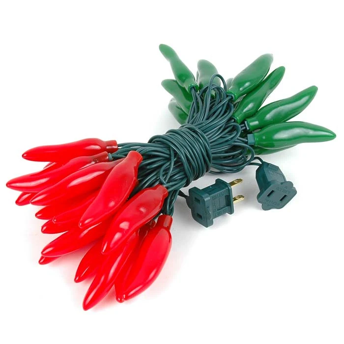 35 light red and green chili pepper string lights are perfect for southwestern themed events or decor. Each sting has 35 lighted red/green chili peppers spaced 4″ apart. The lighted length is 11.5 feet and there is 36 inches between the plug and the first pepper. Every lights set has 2 replacement bulbs and is UL listed for both indoor and outdoor use.