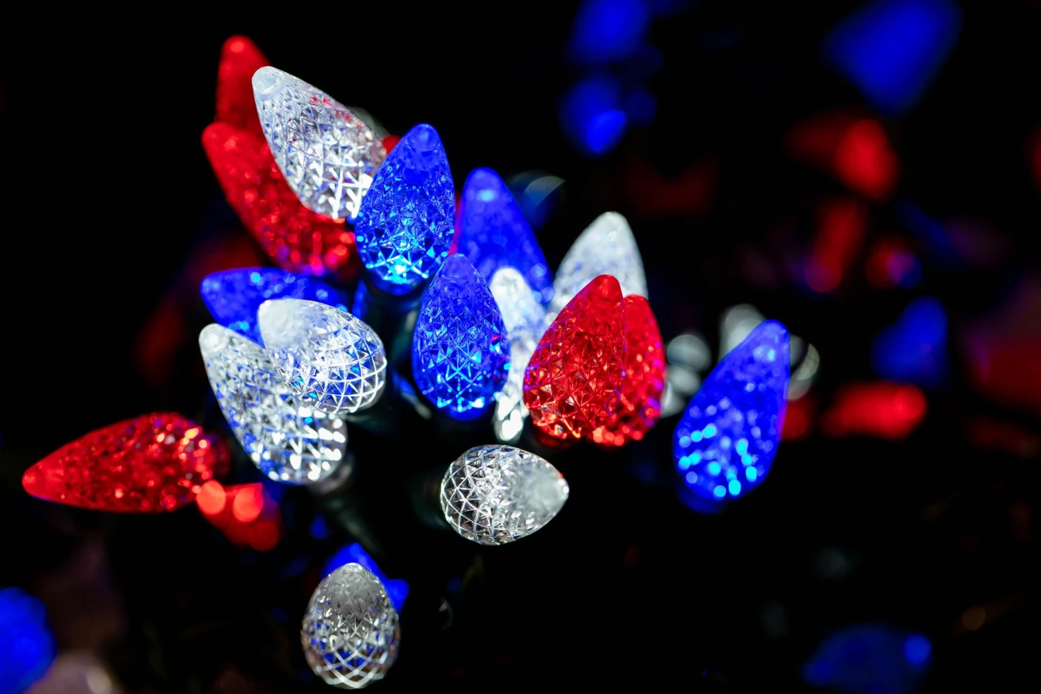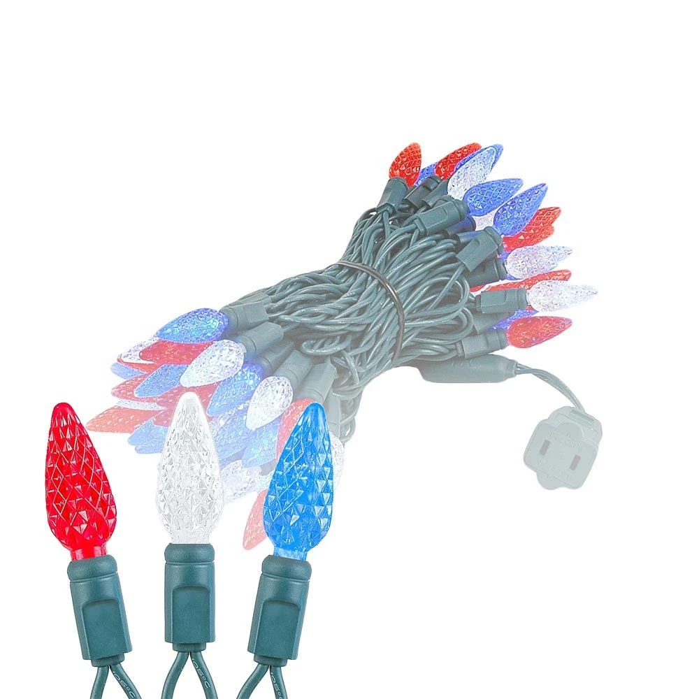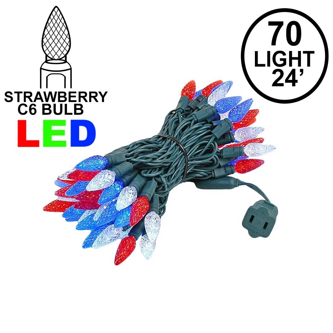 Our 70 light Commercial Grade Red White and Blue C6 LED Strawberry Lights are sure to brighten up any holiday display or special event. These high quality LED Christmas light sets are built using nonremovable high quality super bright LED’s that will last several years. Because these sets use one-piece non-removable bulbs, failures due to broken, damaged, removed, or burnt-out bulbs, are eliminated. These Red white and Blue LED mini light strings have 70 LED’s spaced every 4″ making them 24′ long. Our C6 LED mini Christmas lights have high quality, built-in, full wave rectifiers, making them extremely bright without any flicker. Connect up to 43 strings end-to-end. UL Listed for indoor and outdoor use and Energy Star qualified.