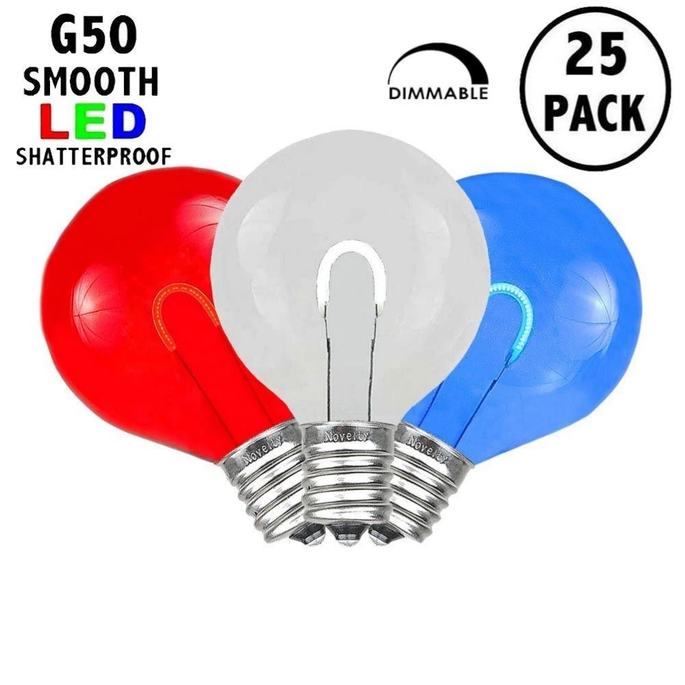 Novelty Lights Red/White/Blue G50 U-Shaped Flexible Filament LED Plastic Filament Retrofit replacement lamps, utilize a Flexible(U-Shaped) Filament design for veiwing from all angles. Switch out those old incandescent G50 bulbs that consume too much energy and break all time for our energy efficient Retro-fit G50’s utilizing LED filament technology. Our bulbs are made of a quality plastic providing a durable LED G50 that will not chip, fade or crack. These Red/White/Blue G50’s are also dimmable making them perfect for animated displays. All of our LED G50’s are energy efficient using only 1 Watts per bulb. Built to last with a 2 season warranty. Our G50 plastic filament LED bulbs will provide years of quality use. Perfect for roofline, patio, backyard BBQ, or other Holiday installation. Our Red/White/Blue plastic G50 bulbs can be used with any of our C9 Stringers (10’, 12.5’, 25′ & 100′), our E17 Heavy Duty Light Strings (25′, 100′ & 330′), our commercial grade bulk C9 Bulk spools as well as our vintage Twisted Wire Strings with E17 Bakelite Sockets. The bulbs are sold in packs of 25 with a quantity discount available if you buy 10 packs of 25 bulbs.