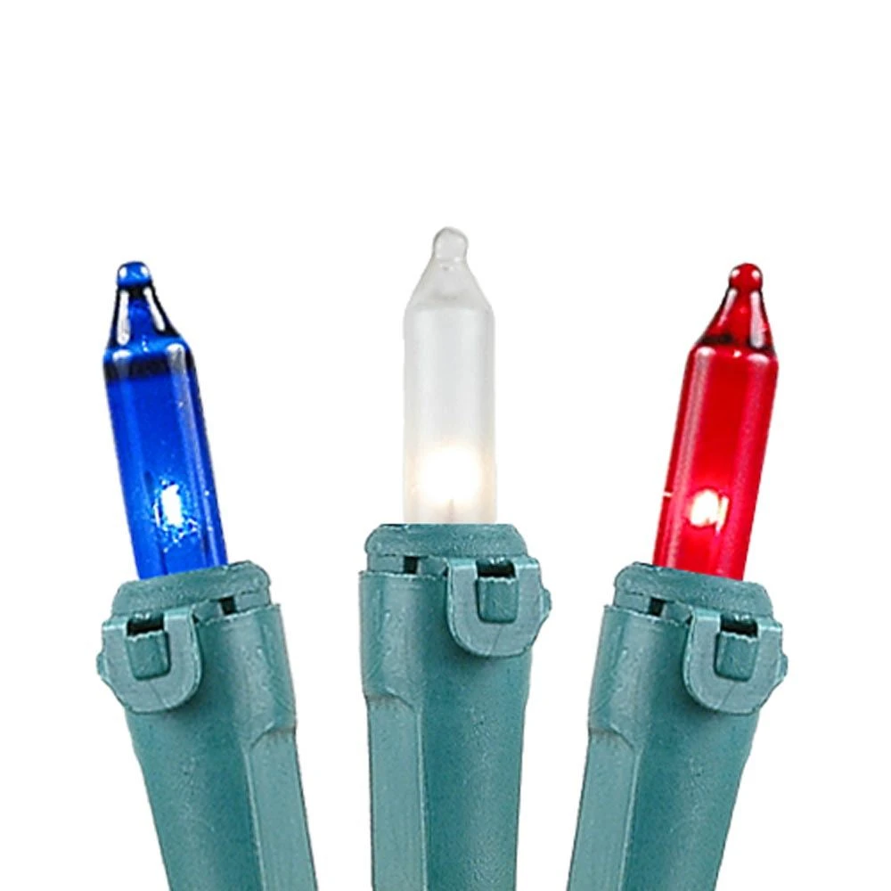 140 light red white and blue chasing set with 4″ spacing 46.5′ long with 16 function controller. Create dazzling and animated christmas light displays using our red white and blue chasing /fading multi function light set. This set uses our premium grade mini light bulb with a 3000 hour bulb life, if one bulb burns out the rest will stay lit. Tested by Novelty Lights to assure the highest quality. UL listed for indoor and outdoor uses.