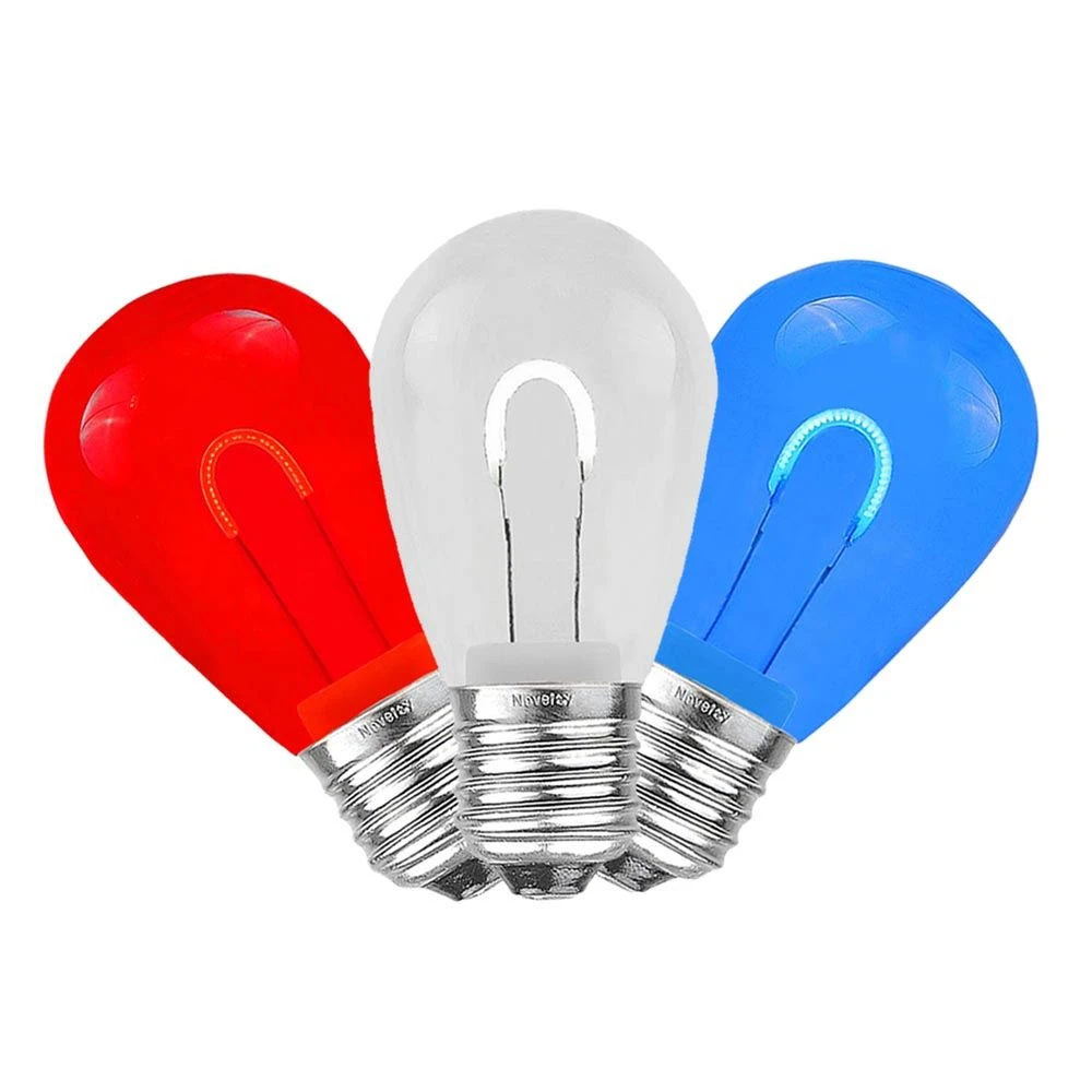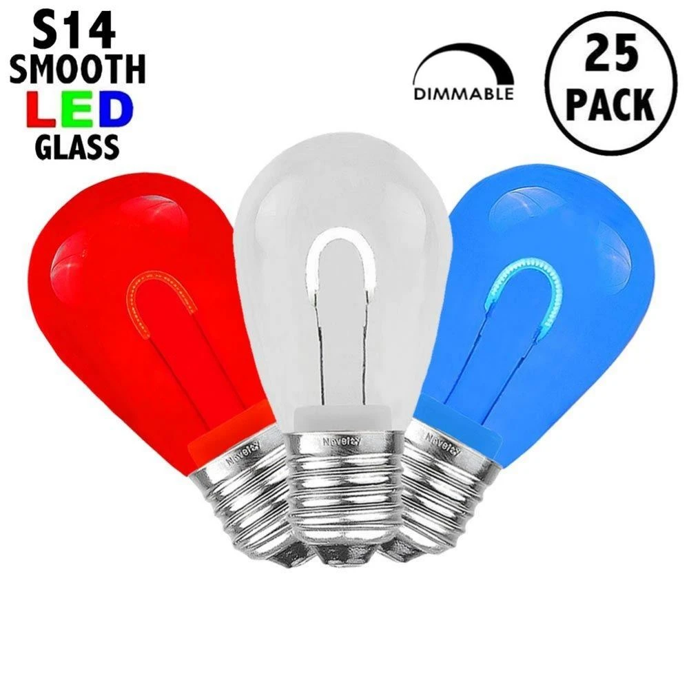 Novelty Lights Red/White/Blue S14 U-Shaped Flexible Filament LED Glass Filament Retrofit replacement lamps, utilize a Flexible(U-Shaped) Filament design for veiwing from all angles. Switch out those old incandescent S14 bulbs that consume too much energy and break all time for our energy efficient Retro-fit S14’s utilizing LED filament technology. These Red/White/Blue S14’s are also dimmable making them perfect for animated displays. All of our LED S14’s are energy efficient using only 1 Watts per bulb. Built to last with a 2 season warranty. Our S14 filament LED bulbs will provide years of quality use. Perfect for roofline, patio, backyard BBQ, or other Holiday installation. Our Red/White/Blue S14 bulbs can be used with any of our commercial grade light strings. The bulbs are sold in packs of 25 with a quantity discount available if you buy 10 packs of 25 bulbs.