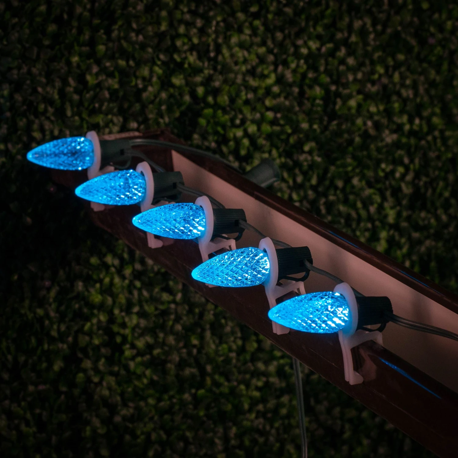Teal Diamond Bright Faceted C9 Retrofit replacement lamps. Our brilliant Teal C9 retrofit bulbs utilize a Super Bright 2 SMD LED creating evenly distributed vivid bright C9 LED. We also use a thick plastic polycarbonate providing a durable LED C9 that will not chip, fade or crack. We also use a special diamond cut prism on the outside of all our Retro-fit bulbs creating brilliant lighting effects. These SMD C9’s are also dimmable making them perfect for animated displays. All of our LED C9’s are energy efficient using only 0.80 Watts and 0.0067 Amps. Built to last with a 3 season warranty. Our C9 Diamond Faceted LED bulbs will provide years of quality use. Perfect for seasoned Christmas light installers, yet easy for anyone to decorate roof lines, trees, buildings, walkways and porches. Switch out those old incandescent C9 bulbs that consume too much energy and break all the time for our energy efficient Retro-fit C9’s utilizing 2 super bright SMD LED technology. Our LED C9 Diamond Faceted bulbs can be used with our C9 stringers (100′, 25′, 12.5′ & 10′), as well as our commercial grade C9 Bulk Spools and our Vintage Twisted Wire Strings with E17 Bakelite Sockets.