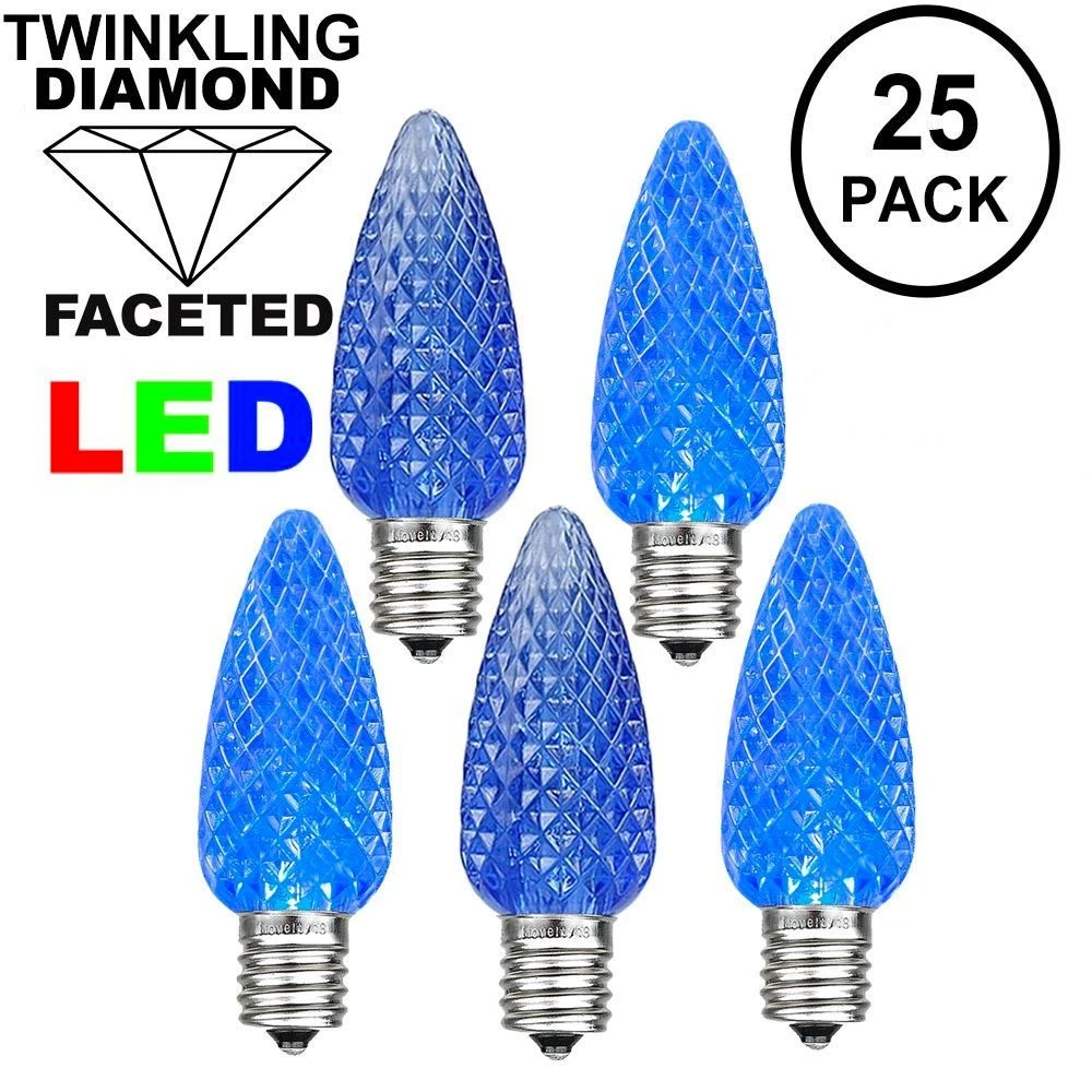 Twinkling Blue Retrofit LED C7 replacement lamps can add something different to this year’s Holiday display. Our Blue twinkling C7 Christmas lights are bright and vibrant and will retro-fit into an Candelabra (e-12) base socket. Our C7 Diamond Faceted Twinkle bulbs are made using a thick plastic polycarbonate providing a durable LED C7 that will not chip, fade or crack. We also use a special diamond cut prism on the outside of all our Retro-fit bulbs creating brilliant lighting effects. All of our LED C7’s are energy efficient using only 0.80 Watts and 0.0067 Amps. Built to last with a 3 season warranty. Our C7 Diamond Faceted Twinkling LED bulbs will provide years of quality use. Perfect for seasoned Christmas light installers, yet easy for anyone to decorate roof lines, trees, buildings, walkways and porches. Switch out those old incandescent C7 bulbs that consume too much energy and break all time for our energy efficient Retro-fit C7’s utilizing 2 super bright SMD LED technology.using our random twinkle C7 LED lights. These Blue twinkling C7 Christmas lights are bright and vibrant and will retro-fit into an candelabra (e-12) base socket, including our C7 Stringers (10’,12.5’,25’ and 100’) our C7 Bulk Spools, or our Vintage e12 Twisted Wire Strings with Bakelite Sockets.
