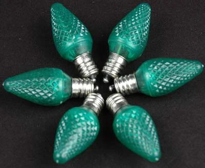 Twinkling Green Retrofit LED C7 replacement lamps can add something different to this year’s Holiday display. Our Green twinkling C7 Christmas lights are bright and vibrant and will retro-fit into an Candelabra (e-12) base socket. Our C7 Diamond Faceted Twinkle bulbs are made using a thick plastic polycarbonate providing a durable LED C7 that will not chip, fade or crack. We also use a special diamond cut prism on the outside of all our Retro-fit bulbs creating brilliant lighting effects. All of our LED C7’s are energy efficient using only 0.80 Watts and 0.0067 Amps. Built to last with a 3 season warranty. Our C7 Diamond Faceted Twinkling LED bulbs will provide years of quality use. Perfect for seasoned Christmas light installers, yet easy for anyone to decorate roof lines, trees, buildings, walkways and porches. Switch out those old incandescent C7 bulbs that consume too much energy and break all time for our energy efficient Retro-fit C7’s utilizing 2 super bright SMD LED technology.using our random twinkle C7 LED lights. These Green twinkling C7 Christmas lights are bright and vibrant and will retro-fit into an candelabra (e-12) base socket, including our C7 Stringers (10’,12.5’,25’ and 100’) our C7 Bulk Spools, or our Vintage e12 Twisted Wire Strings with Bakelite Sockets.