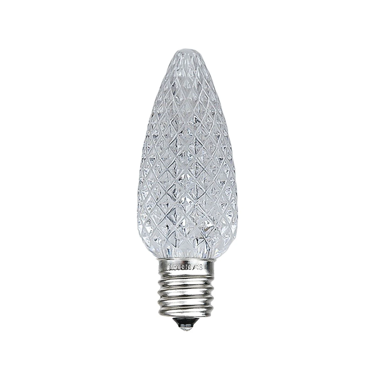 Twinkling Pure White Retrofit LED C9 replacement lamps can add something different to this year’s Holiday display. Our Pure White twinkling C9 Christmas lights are bright and vibrant and will retro-fit into an intermediate (e-17) base socket. Our C9 Diamond Faceted Twinkle bulbs are made using a thick plastic polycarbonate providing a durable LED C9 that will not chip, fade or crack. We also use a special diamond cut prism on the outside of all our Retro-fit bulbs creating brilliant lighting effects. All of our LED C9’s are energy efficient using only 0.80 Watts and 0.0067 Amps. Built to last with a 3 season warranty. Our C9 Diamond Faceted Twinkling LED bulbs will provide years of quality use. Perfect for seasoned Christmas light installers, yet easy for anyone to decorate roof lines, trees, buildings, walkways and porches. Switch out those old incandescent C9 bulbs that consume too much energy and break all time for our energy efficient Retro-fit C9’s utilizing 2 super bright SMD LED technology. Our LED C9 Diamond Faceted Twinkling bulbs can be used with our C9 stringers (100′, 25′, 12.5′ & 10′), as well as our commercial grade C9 Bulk Spools and our Vintage Twisted Wire Strings with E17 Bakelite Sockets.