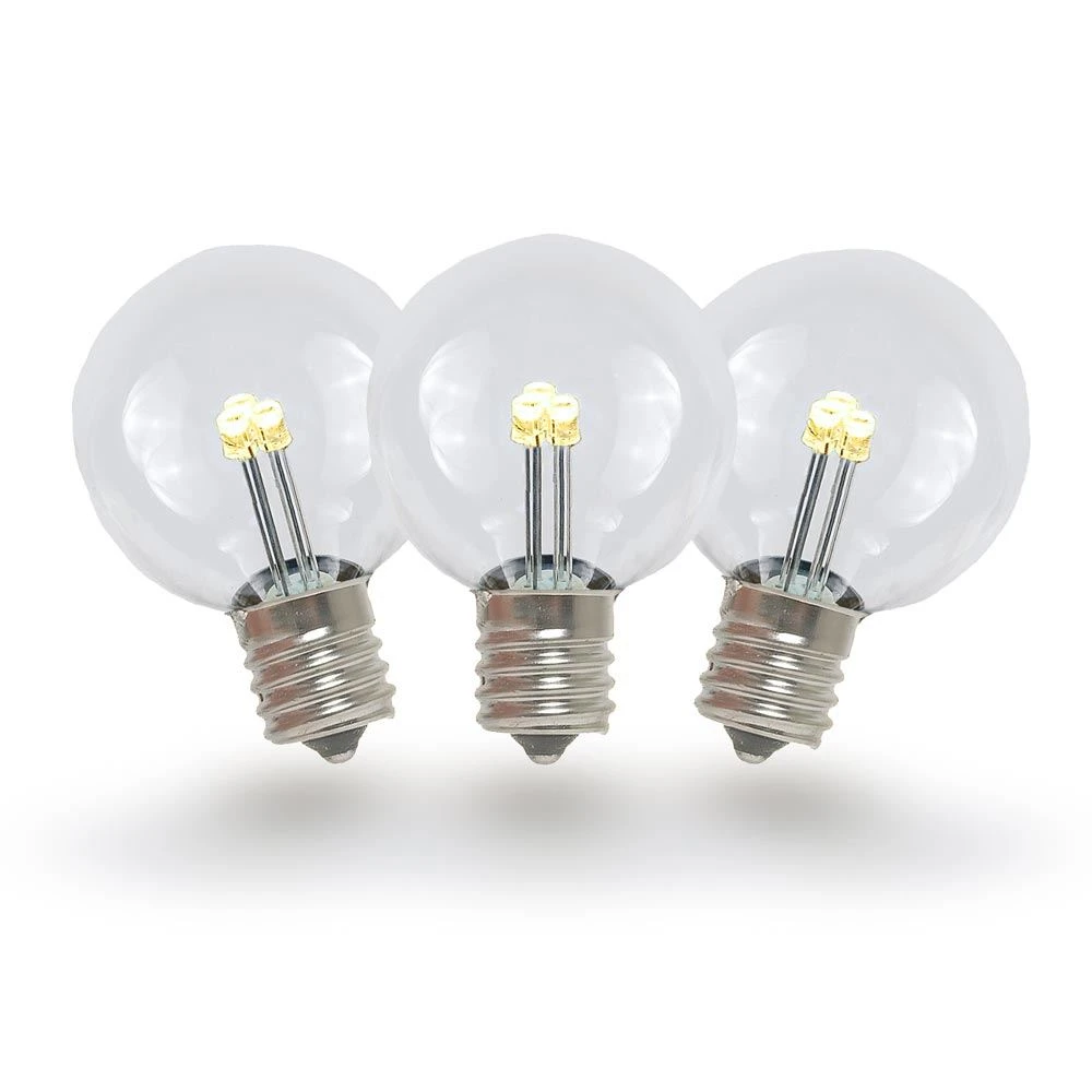 Novelty Lights G30 Warm White glass bulbs will give you the look of the traditional glass incandescent bulb without the added energy cost. Our glass G30 bulbs are energy efficient using only .60 watts per bulb, each bulb has 3 vibrant diodes, does not produce heat, and is vibration resistant. Our Warm White G30 glass LED bulbs can be used for a variety of indoor and outdoor displays, brighten up your roofline, trees, patio or other creative display for everyday use or Holiday cheer. Our Warm White G30 glass bulbs have a 3 season, 40,000 hour warranty, if you want top quality, long lasting, bright and beautiful globe lights, then our glass LED G30 bulbs are the stunning, smart, and energy-efficient solution. Our G30 glass LED bulbs can be used with our C7 Stringers (10’, 12.5’, 25′ & 100′), our E12 Heavy Duty Light Strings (25′, 100′ & 330′), our commercial grade bulk C7 Bulk spools as well as our vintage Twisted Wire Strings with E12 Bakelite Sockets.