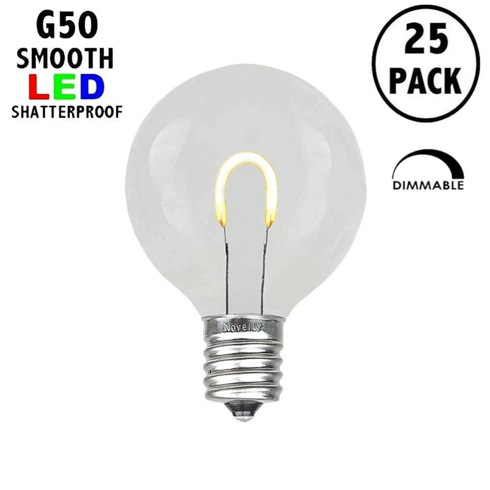 Novelty Lights Warm White G50 U-Shaped Flexible Filament LED Plastic Filament Retrofit replacement lamps, utilize a Flexible(U-Shaped) Filament design for veiwing from all angles. Switch out those old incandescent G50 bulbs that consume too much energy and break all time for our energy efficient Retro-fit G50’s utilizing LED filament technology. Our bulbs are made of a quality plastic providing a durable LED G50 that will not chip, fade or crack. These Warm White G50’s are also dimmable making them perfect for animated displays. All of our LED G50’s are energy efficient using only 1 Watts per bulb. Built to last with a 2 season warranty. Our G50 plastic filament LED bulbs will provide years of quality use. Perfect for roofline, patio, backyard BBQ, or other Holiday installation. Our Warm White plastic G50 bulbs can be used with any of our C9 Stringers (10’, 12.5’, 25′ & 100′), our E17 Heavy Duty Light Strings (25′, 100′ & 330′), our commercial grade bulk C9 Bulk spools as well as our vintage Twisted Wire Strings with E17 Bakelite Sockets. The bulbs are sold in packs of 25 with a quantity discount available if you buy 10 packs of 25 bulbs.