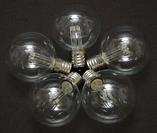 Novelty Lights G50 Warm White globe LED glass bulbs with 5 super bright and energy efficient LEDs will bring beauty to your next decorating project. The G50 glass bulb, unlike it’s incandescent counter-parts, will not get hot, giving you more options for indoor and outdoor applications! The G50 Glass Warm White bulb will bring that traditional and classic look to your roofline, patio, backyard BBQ, or other Holiday installation. The G50 glass bulbs use only .65 watts per bulb and have a 3 season; 40,000 hour warranty. Our Warm White glass G50 bulbs can be used with any of our C9 Stringers (10’, 12.5’, 25′ & 100′), our E17 Heavy Duty Light Strings (25′, 100′ & 330′), our commercial grade bulk C9 Bulk spools as well as our vintage Twisted Wire Strings with E17 Bakelite Sockets. Our G50 glass LED bulbs will not discolor or fade, the bulbs are sold in packs of 25 with a quantity discount available if you buy 10 packs of 25 bulbs.