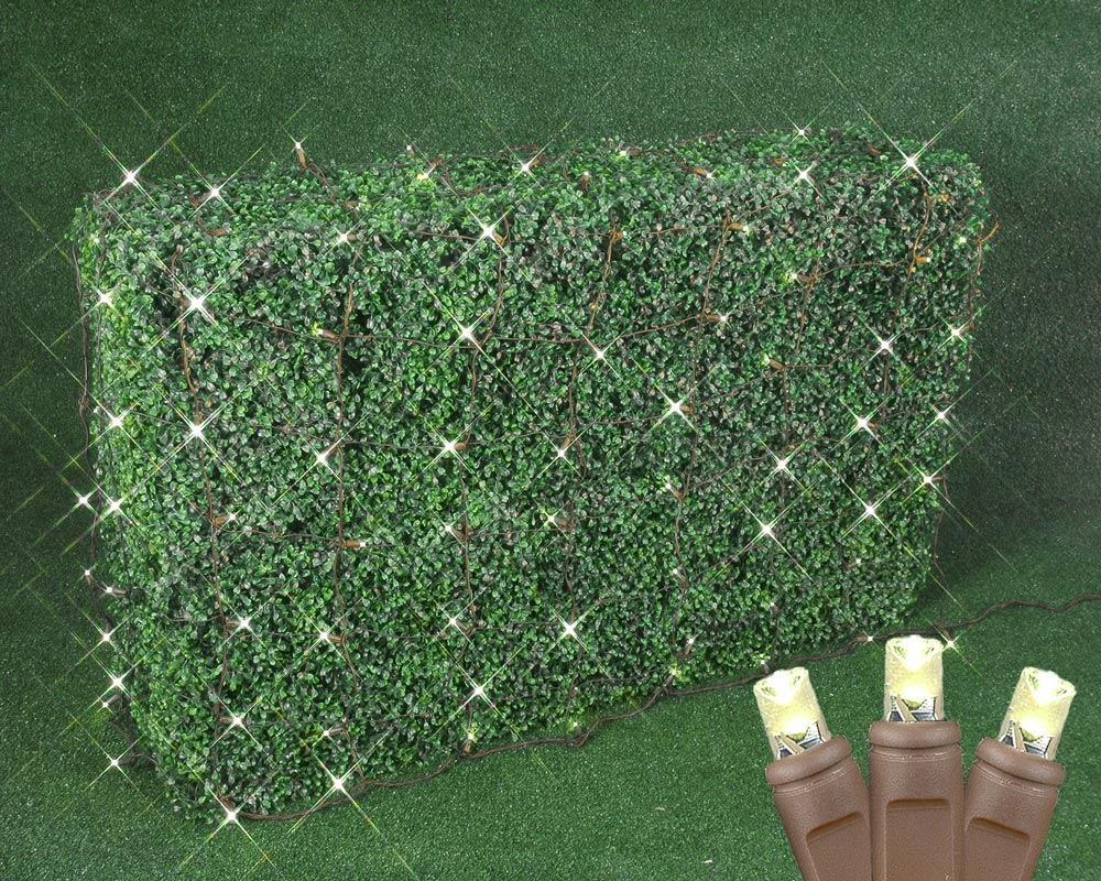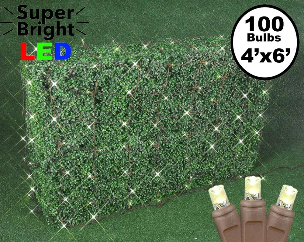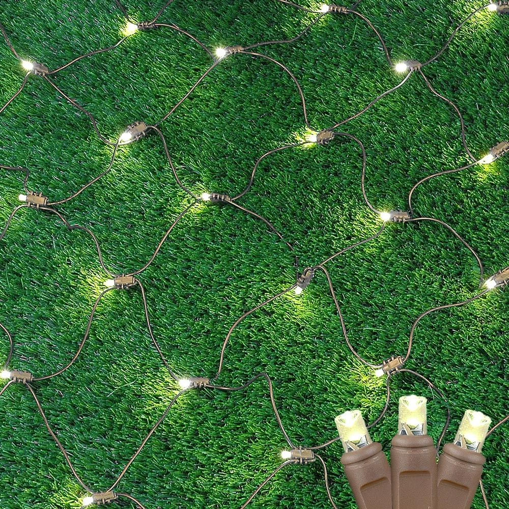 Our Warm White LED Brown wire net lights feature a total of 100 super bright wide angle 5mm LED bulbs. Great for decorating hedges, bushes, shrubs, or wrapping tree trunks. These nets ensure an even distribution of the brilliant LED lights. So simple to use, these LED Net Lights will reduce your installation time and save you money because they are energy efficient, burn cooler, and last longer than the incandescent alternative. Connect up to 21 sets together with the end-to-end plugs. UL Listed for safe use indoors and outdoors.