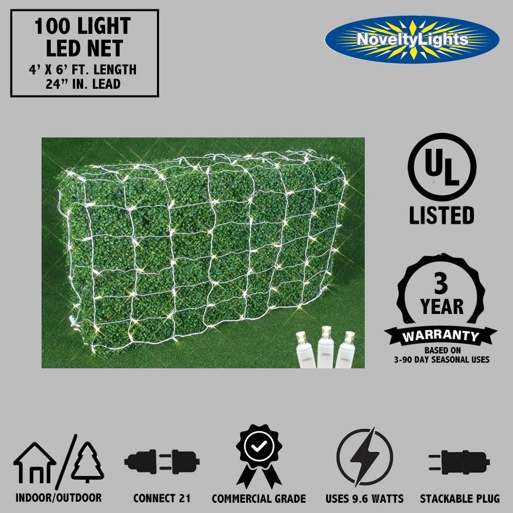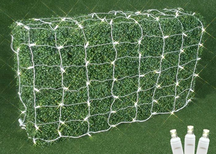 Our Warm White LED white wire net lights feature a total of 100 super bright wide angle 5mm LED bulbs. Great for decorating hedges, bushes, shrubs, or wrapping tree trunks. These nets ensure an even distribution of the brilliant LED lights. So simple to use, these Warm White LED Net Lights will reduce your installation time and save you money because they are energy efficient, burn cooler, and last longer than the incandescent alternative. Connect up to 21 sets together with the end-to-end plugs. UL Listed for safe use indoors and outdoors.
