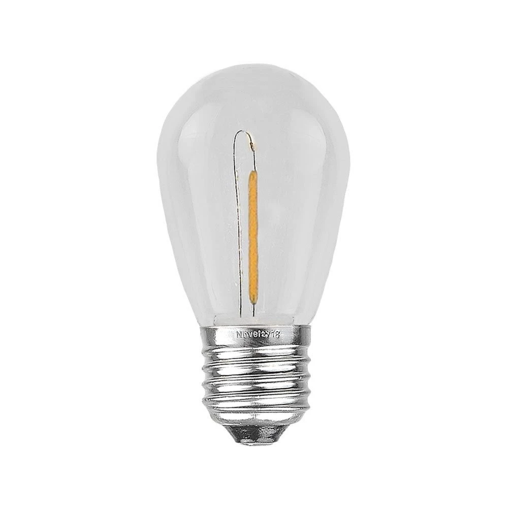Save money and energy using our ultra bright warm white LED plastic filament S14 bulbs. Perfect for replacing old inefficient 11 watt incandescent medium base bulbs at your bar, restaurant, beer garden, or outdoor patio living area. These warm (sun) white e26 LED s14 bulbs only use 0.9 watts per bulb and have a 15,000 hour bulb life making these perfect for permanent applications using our commercial grade light strings. These led bulbs are shatterproof plastic and are the most durable and energy efficient S14 LED bulbs. These LED bulbs will pay for themselves with the money you save on you electric bill! Our bulbs are sold in packs with 25 warm white bulbs and are great for indoor and outdoor use.