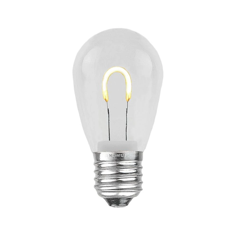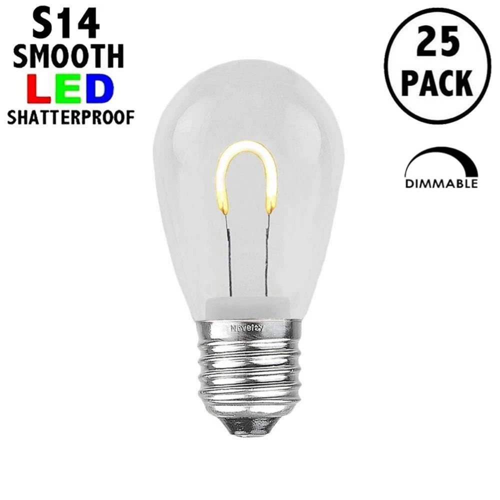 Novelty Lights Warm White S14 U-Shaped Flexible Filament LED Plastic Filament Retrofit replacement lamps, utilize a Flexible(U-Shaped) Filament design for veiwing from all angles. Switch out those old incandescent S14 bulbs that consume too much energy and break all time for our energy efficient Retro-fit S14’s utilizing LED filament technology. Our bulbs are made of a quality plastic providing a durable LED S14 that will not chip, fade or crack. These Warm White S14’s are also dimmable making them perfect for animated displays. All of our LED S14’s are energy efficient using only 1 Watts per bulb. Built to last with a 2 season warranty. Our S14 plastic filament LED bulbs will provide years of quality use. Perfect for roofline, patio, backyard BBQ, or other Holiday installation. Our Warm White plastic S14 bulbs can be used with any of our commercial grade light strings. The bulbs are sold in packs of 25 with a quantity discount available if you buy 10 packs of 25 bulbs.