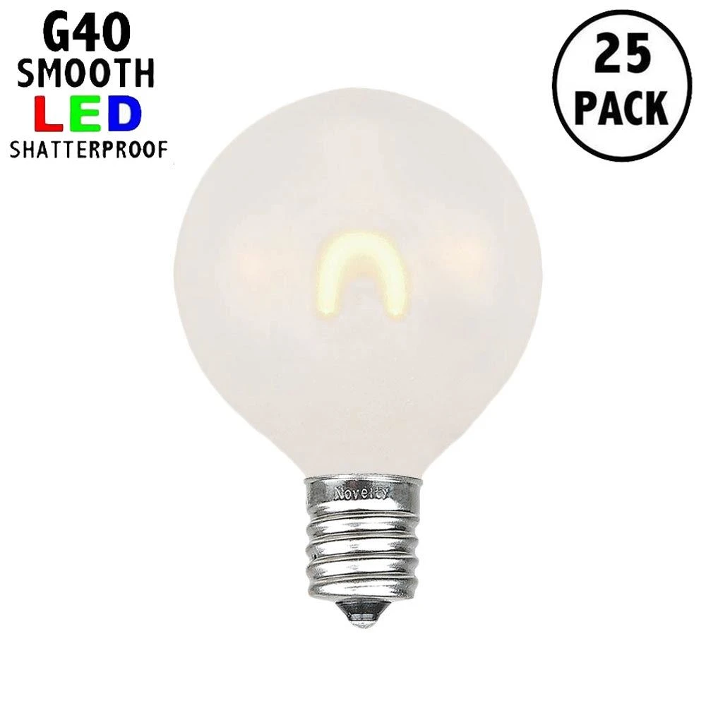 Novelty Lights Warm White G40 U-Shaped Flexible Filament LED Plastic Filament Retrofit replacement lamps, utilize a Flexible(U-Shaped) Filament design for veiwing from all angles. Switch out those old incandescent G40 bulbs that consume too much energy and break all time for our energy efficient Retro-fit G40’s utilizing LED filament technology. Our bulbs are made of a quality plastic providing a durable LED G40 that will not chip, fade or crack. These Warm White G40’s are also dimmable making them perfect for animated displays. All of our LED G40’s are energy efficient using only 1 Watts per bulb. Built to last with a 2 season warranty. Our G40 plastic filament LED bulbs will provide years of quality use. Perfect for roofline, patio, backyard BBQ, or other Holiday installation. Our G40 Warm White plastic LED bulbs can be used with our C7 Stringers (10’, 12.5’, 25′ & 100′), our E12 Heavy Duty Light Strings (25′, 100′ & 330′), our commercial grade bulk C7 Bulk spools as well as our vintage Twisted Wire Strings with E12 Bakelite Sockets.