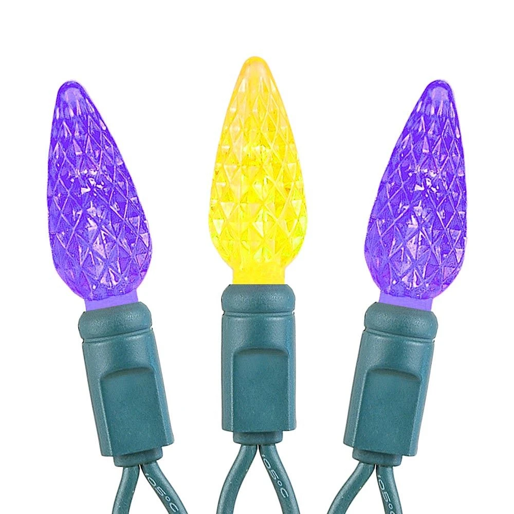 Our 70 light Commercial Yellow and Purple C6 LED Strawberry Lights are sure to brighten up any holiday display or special event. These high quality LED Christmas light sets are built using nonremovable high quality super bright LED’s that will last several years. Because these sets use one-piece non-removable bulbs, failures due to broken, damaged, removed, or burnt-out bulbs, are eliminated. These Yellow and Purple LED mini light strings have 70 LED’s spaced every 4″ making them 24′ long. Our C6 LED mini Christmas lights have high quality, built-in, full wave rectifiers, making them extremely bright without any flicker. Connect up to 43 strings end-to-end. UL Listed for indoor and outdoor use and Energy Star qualified.