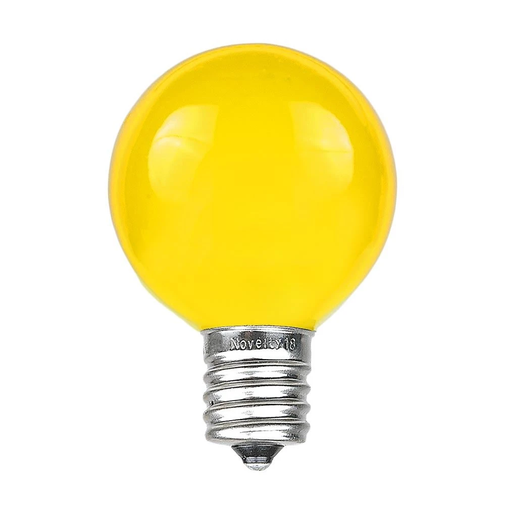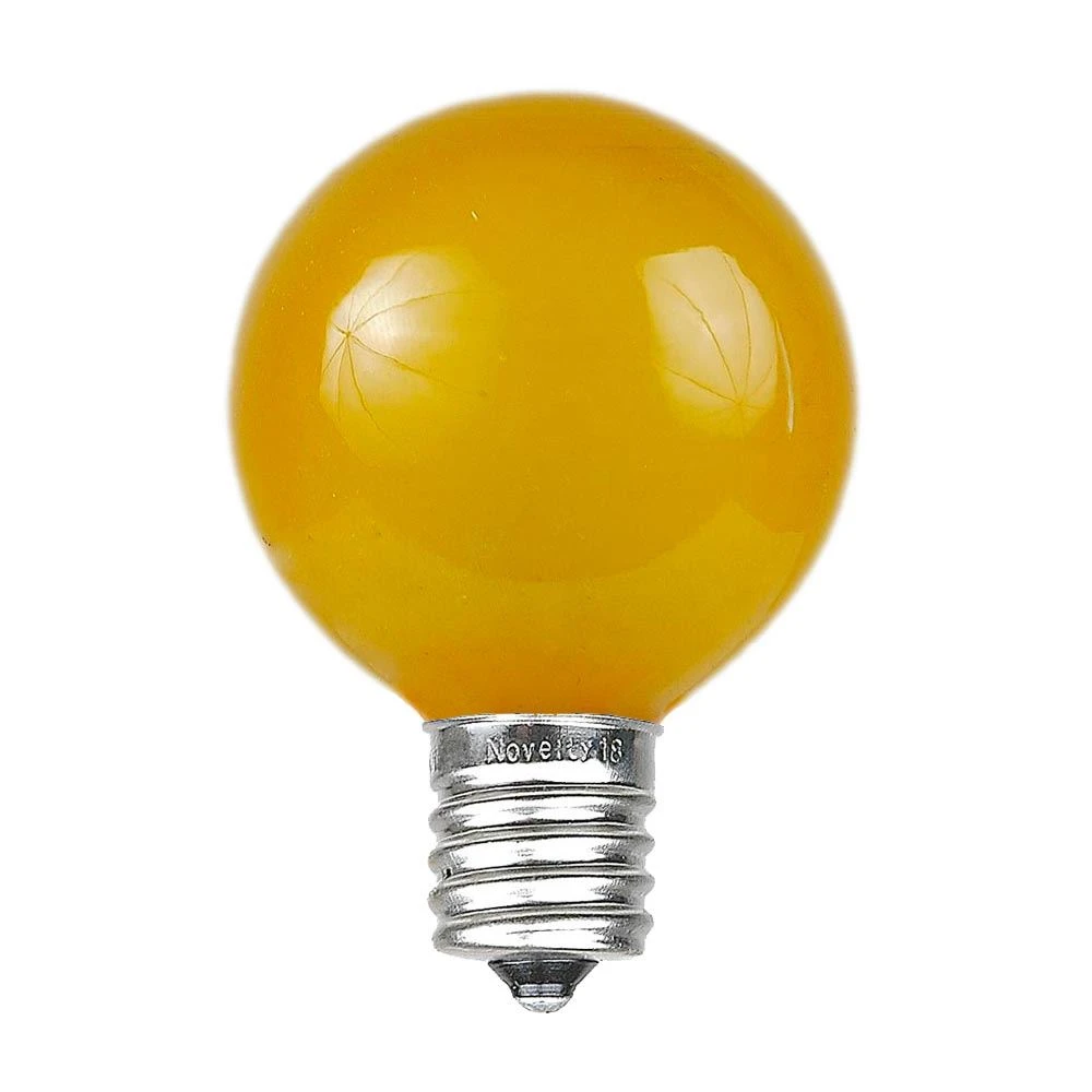 Our Yellow globe-shaped, satin finish G50 Bulbs create a fun, unique look when decorating for any special occasion. Perfect for weddings, tents, patios, awnings and Christmas decor. These round, 7-watt, 130-volt bulbs will shine for 3000 hours. Use with our C9 Commercial Grade strings, our Heavy Duty Intermediate (e17) Stringers, 0ur C9 1000’,500’, 250’ Bulk Spools and our Vintage Twisted Wire String with Bakelite Sockets. Our G50 satin Yellow bulbs are sold in packs of 25. You will qualify for a wholesale discount when buying at least 20 packs of 25 bulbs.